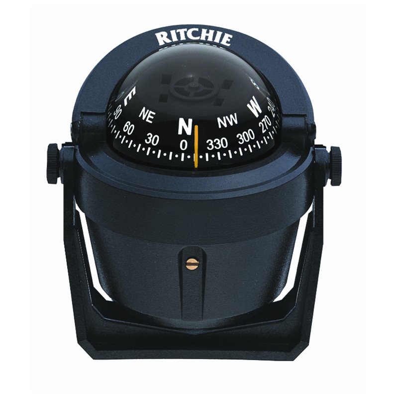 The Ritchie B-51 Explorer is a versatile bracket-mounted marine compass designed for small powerboats and sailboats. This compact 2 3/4-inch direct-reading compass features adjustable bracket mounting with thumbscrews for easy installation and removal, making it ideal for portable applications or temporary installations.