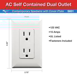 The RV Designer S831 is a self-contained dual AC outlet designed specifically for RV electrical systems. This white outlet features integrated Speedwire technology and includes a matching cover plate for a clean, finished appearance.