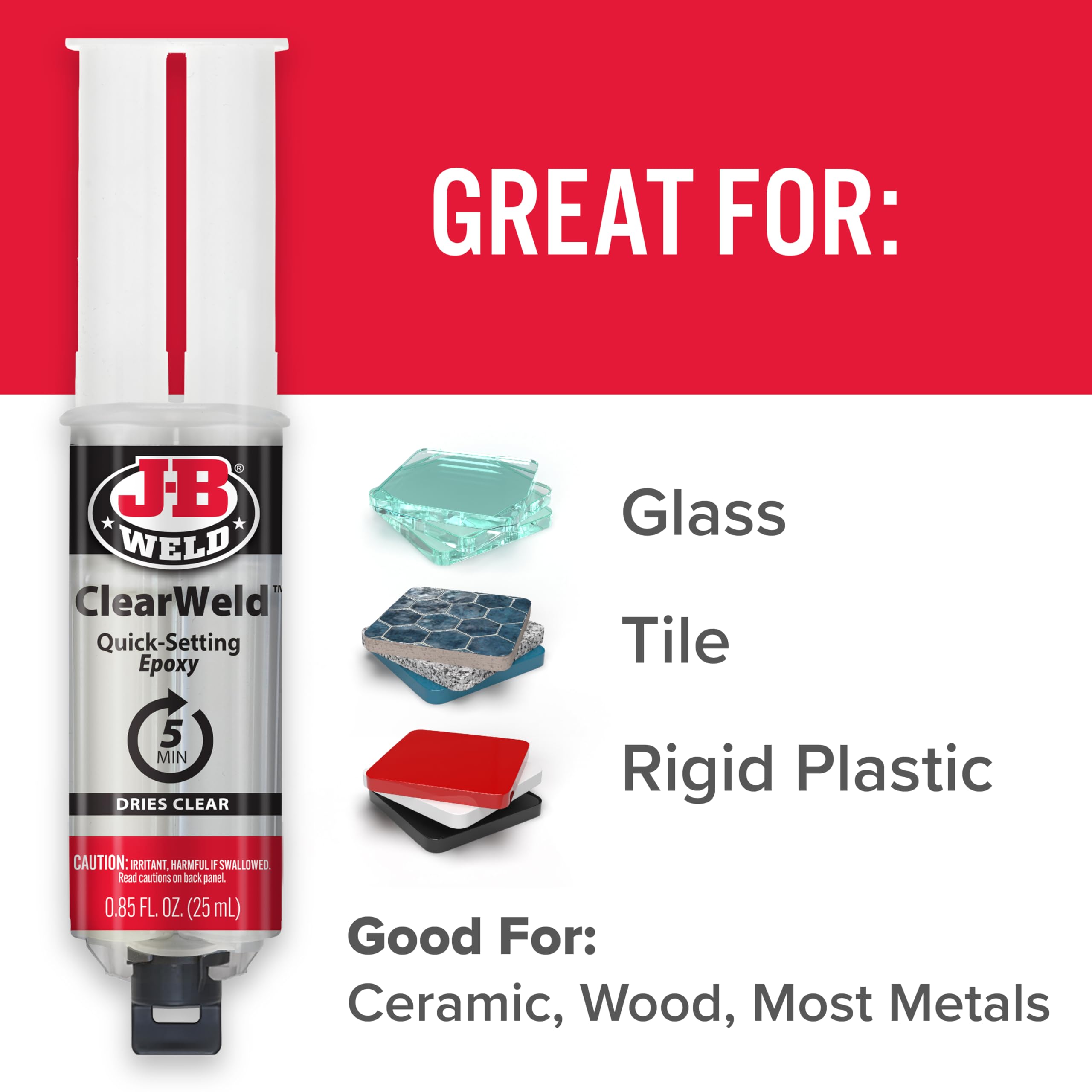 JB Weld ClearWeld is a crystal-clear, fast-setting epoxy adhesive designed for quick repairs on transparent and translucent surfaces. This two-part epoxy sets in just 5 minutes and fully cures in 1 hour, providing a strong, nearly invisible bond that won't detract from the appearance of glass, ceramic, tile, porcelain, and other smooth surfaces.