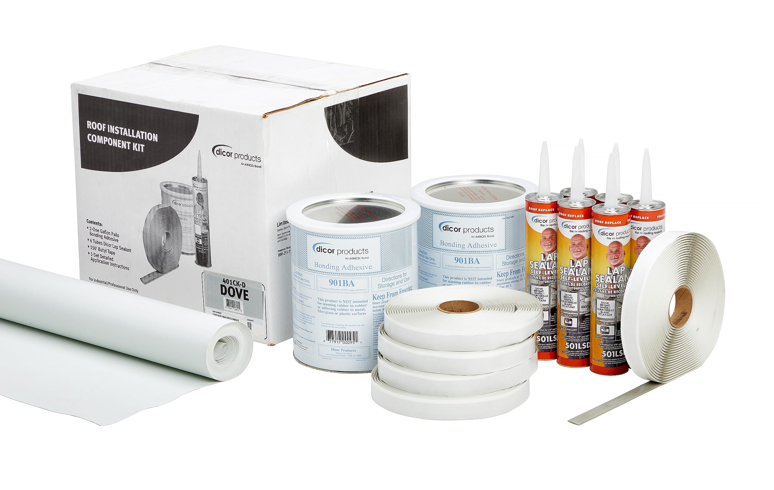 The Dicor 401CK-D is a complete RV roof installation kit designed for installing Dove White EPDM and TPO roof membranes. This comprehensive kit provides all the essential components needed for professional-grade RV roof installation, making it the ideal solution for service centers and DIY installers tackling complete roof replacements.
