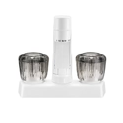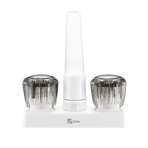 The Dura Faucet DFPK640SWT is a dual-handle non-metallic kitchen and bar faucet designed specifically for RV, marine, and mobile applications. This compact 4-inch faucet features a durable white finish that resists corrosion and complements a variety of interior styles.
