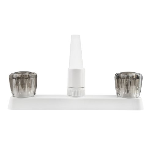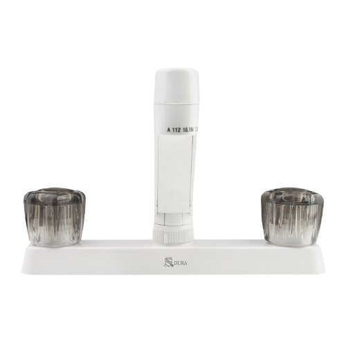 The Dura Faucet DFPK600SWT is a two-handle non-metallic kitchen faucet designed specifically for RVs, featuring a powder-coated white finish and smoked acrylic knobs. Crafted from premium grade lightweight synthetic waterways, this faucet offers the perfect balance of durability and reduced weight for mobile applications.