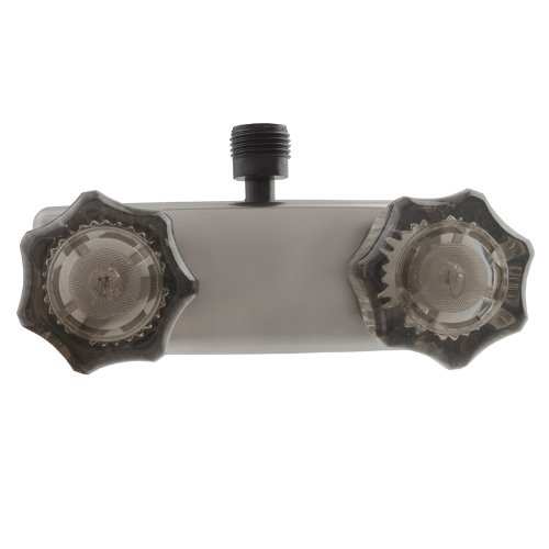The Dura Faucet DFSA100SSN is a premium RV shower faucet designed specifically for recreational vehicle applications. Featuring an attractive satin nickel finish with smoked knobs, this faucet combines style with functionality for your mobile bathroom.