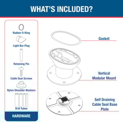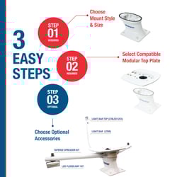 This mount requires a separately purchased Seaview Modular Top Plate specific to your equipment (radar, satellite dome, camera, or searchlight). The modular approach provides long-term cost savings—when upgrading electronics, simply replace the top plate rather than the entire mount assembly.