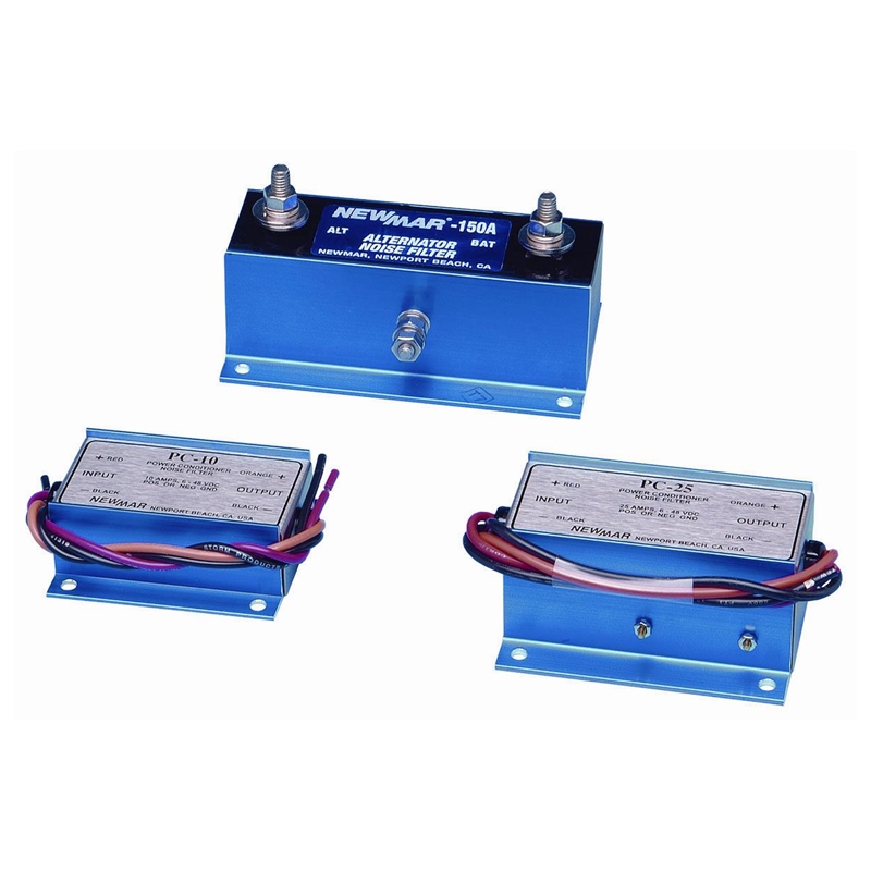 The NewMar PC-10 Power Conditioner is a specialized noise filter designed to eliminate electrical interference that can disrupt marine and vehicle electronics. Alternators, ignition systems, motors, and other electrical components generate electronic "noise" that causes static on radios, audio distortion, and visual artifacts on displays. This in-line filter effectively attenuates conducted line noise to restore clean power to sensitive equipment.
