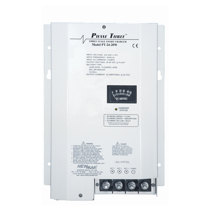 NewMar PT-40 Phase Three 40a, 12v Battery Charger, Mfg# Pt-40u, 40 Amp, 12 Vdc Output, 120/240vac 50/60hz Input, 3 Banks, 2 Yr. Warranty. Three Stage "smart" Charger. Dimensions: 14.1"h X 9.5"w X 4.0"d; Wt: 12 Lbs.