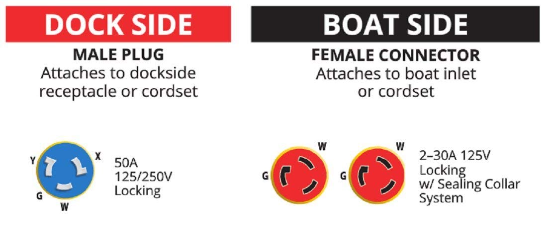 • Male connector: 50A 125/250V locking configuration attaches to dockside receptacle