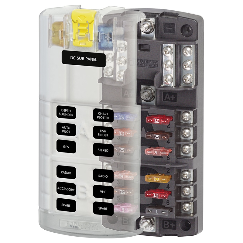 This fuse block can be powered from a single breaker on your main distribution panel and supply protected power to 12 additional circuits. Includes 20 write-on labels and accepts square pre-made labels. Fuses sold separately. Backed by Blue Sea Systems lifetime warranty.