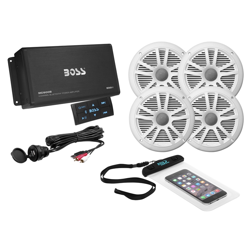 This kit includes everything needed for a full audio installation: the MC900B 4-channel weatherproof amplifier with integrated Bluetooth and multi-function controller, two pairs of 6.5-inch MR6W marine speakers in white, a waterproof storage pouch, USB/AUX accessory extension cable, mounting hardware, and instruction manuals.