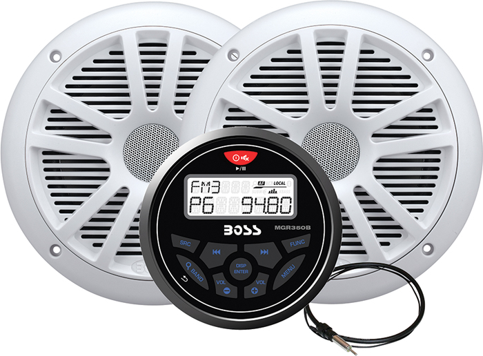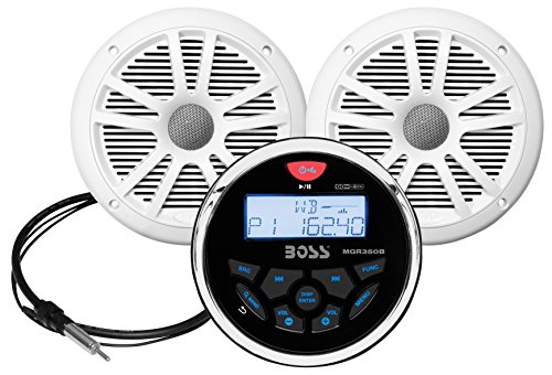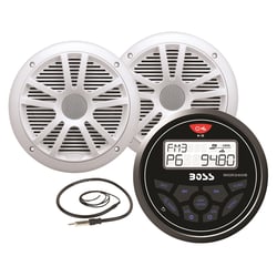 The Boss Audio Systems MCKGB350W.6 is a complete marine audio package designed for boats, marine vessels, and outdoor powersports applications. This all-in-one kit includes everything needed for a premium marine audio upgrade: an MGR350B in-dash gauge-style AM/FM digital media receiver with Bluetooth, a pair of 6.5-inch MR6B marine speakers with white finish, and an MRANT10 marine antenna.