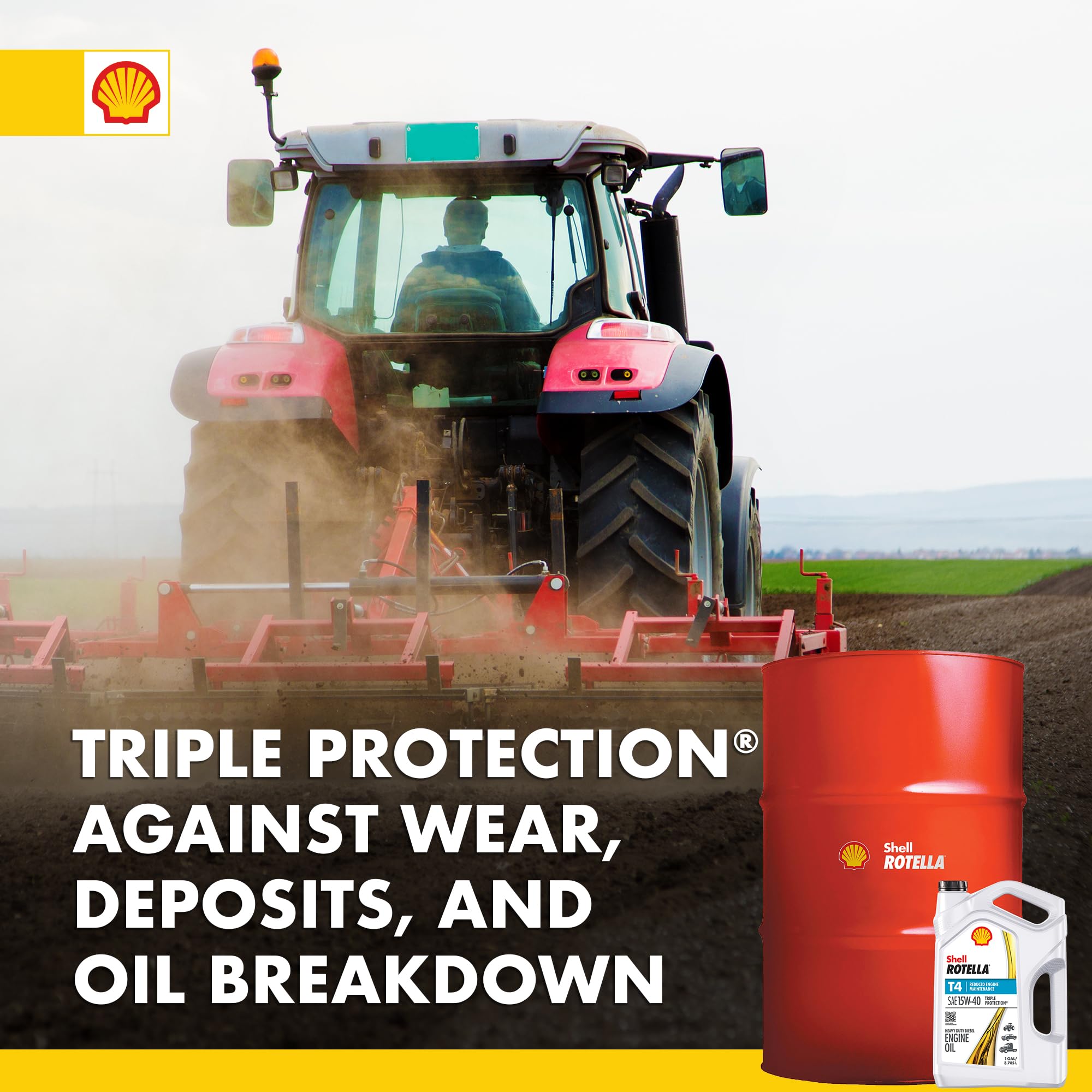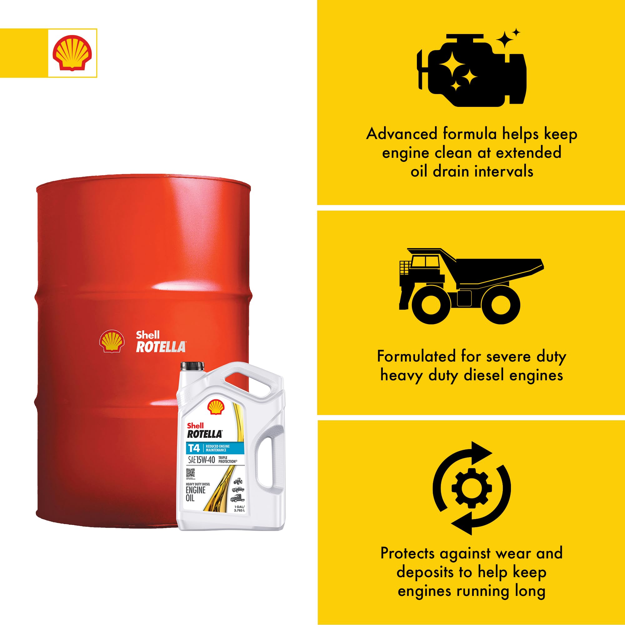 Shell Rotella T4 Triple Protection 15W-40 diesel engine oil provides exceptional wear protection for longer life in a wide range of heavy-duty engines—from diesel pickup trucks to tractors to tractor trailers. It uses advanced additive technology for superior engine cleanliness throughout the oil drain interval to protect under the most severe engine conditions found in modern, low-emission engines and older hard-working diesel engines.