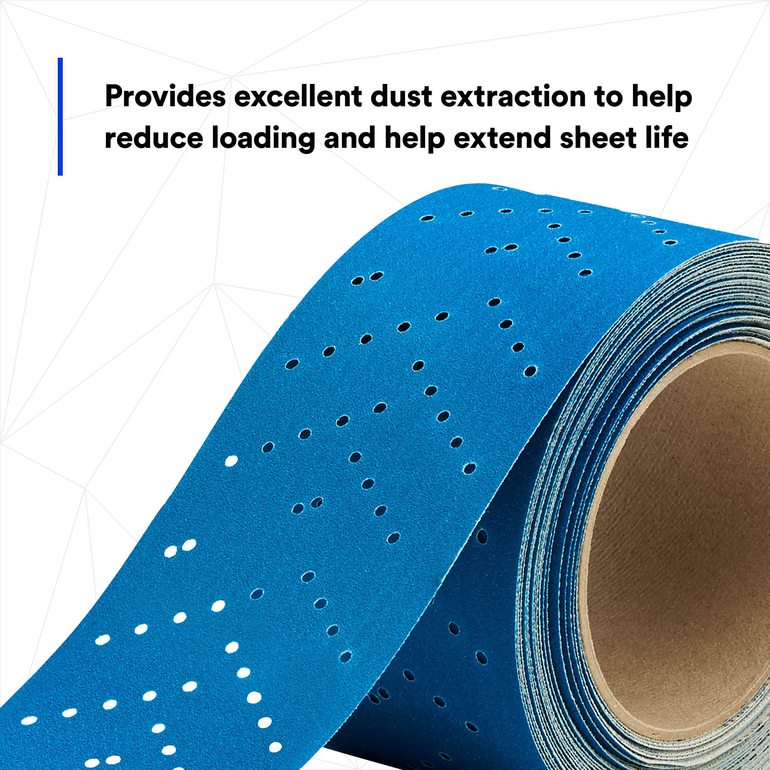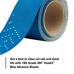 The 3M 36191 Blue Abrasive Hookit Sheet Roll delivers professional-grade performance for paint removal and filler sanding applications. This 2-3/4" x 13-yard roll features an advanced engineered ceramic mineral blend that combines ceramic grain with premium aluminum oxide for best-in-class cutting power and extended abrasive life.