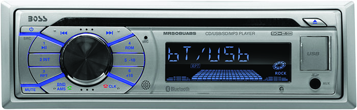 The Boss Audio Systems MR508UABS is a weatherproof marine stereo receiver designed for boats, ATVs, UTVs, and other powersports applications. This single-DIN head unit delivers 50 watts x 4 channels of maximum power and features built-in Bluetooth for hands-free calling and wireless audio streaming from your smartphone.