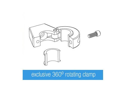 • Unique rotating articulating clamps mount to straight or angled rails