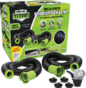 The Thetford Titan Premium RV Sewer Hose Kit is designed to make emptying holding tanks more pleasant with premium-quality features RVers have come to expect from the sanitation expert. The proprietary TPE (Thermal Plastic Elastomer) construction provides the highest degree of puncture and abrasion resistance, excelling in extreme temperatures. The hose is virtually uncrushable and prevents leaks, bouncing back into shape even after being run over.