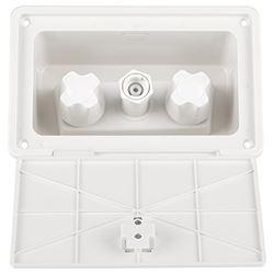 The Dura Faucet DFSA185WT Exterior Spray Box provides a convenient outdoor water source for your RV, camper, or trailer. This complete assembly includes a quick connect valve integrated into a durable weather-resistant housing, perfect for washing vehicles, rinsing equipment, or cleaning outdoor gear.