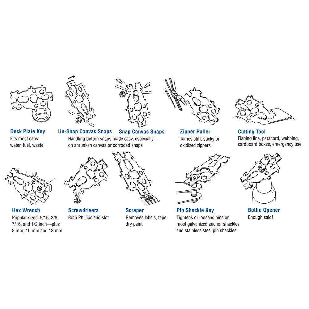 The Davis Instruments 382 Snap Tool Multi-Key is a versatile pocket-sized marine tool designed for boaters and outdoor enthusiasts. This compact stainless steel multi-tool serves primarily as a deck plate key for opening inspection ports and hatches, while offering multiple functions in one rugged design.