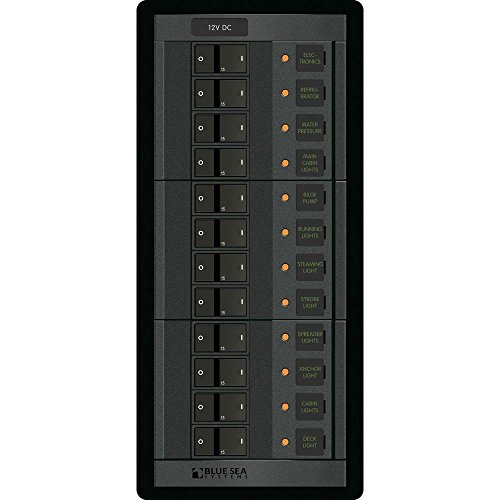 The Blue Sea Systems 1223 is a 12-position DC circuit breaker panel designed for marine and RV electrical systems. This comprehensive power distribution solution comes pre-installed with twelve 15-amp A-Series flat rocker circuit breakers, providing reliable overcurrent protection for up to 12 branch circuits.