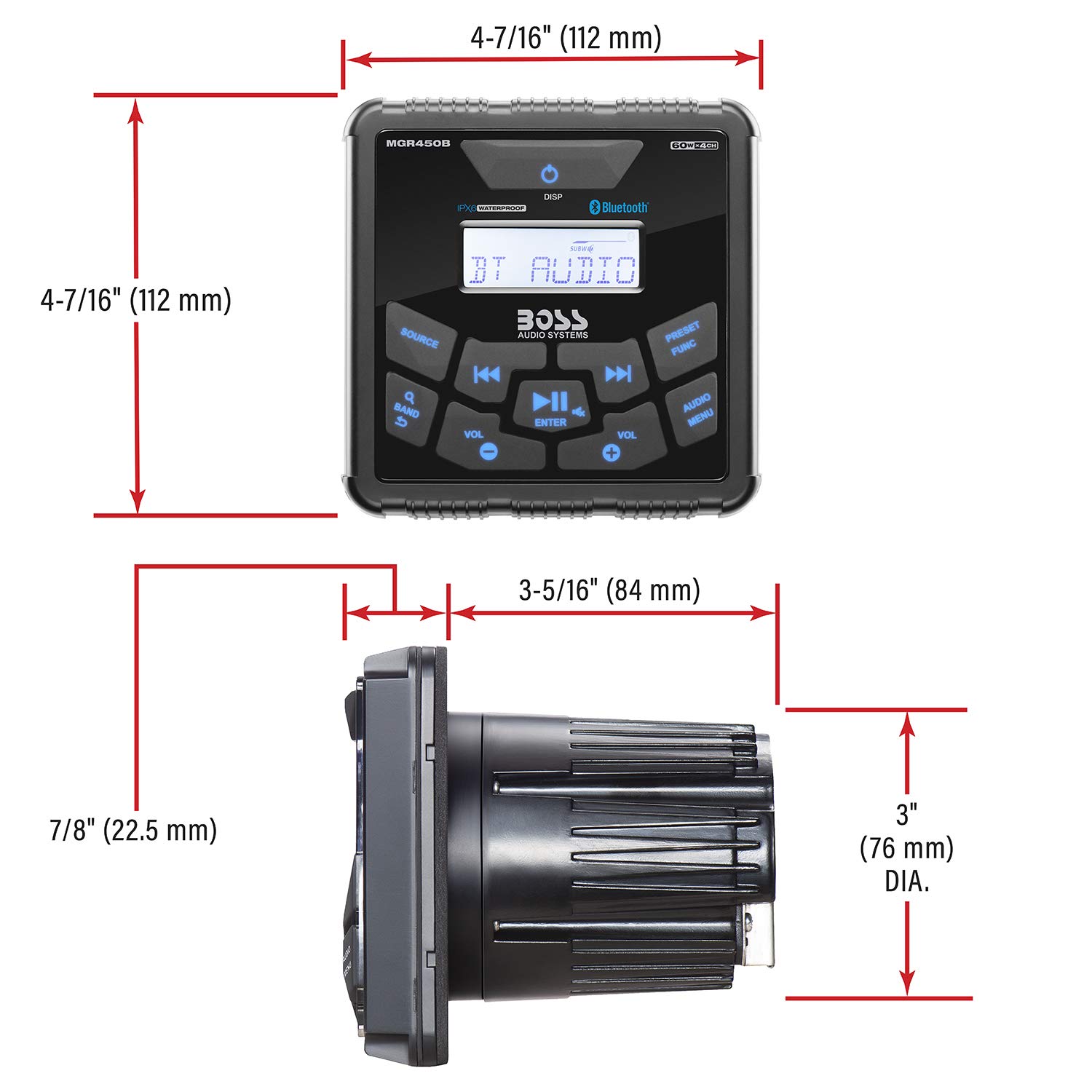 The Boss Audio Systems MGR450B is a weatherproof Bluetooth digital media receiver designed specifically for marine, powersports, and off-road applications. This compact gauge-style head unit fits into a standard 3-inch gauge opening, making it ideal for boats, UTVs, ATVs, and motorcycles where space is limited.