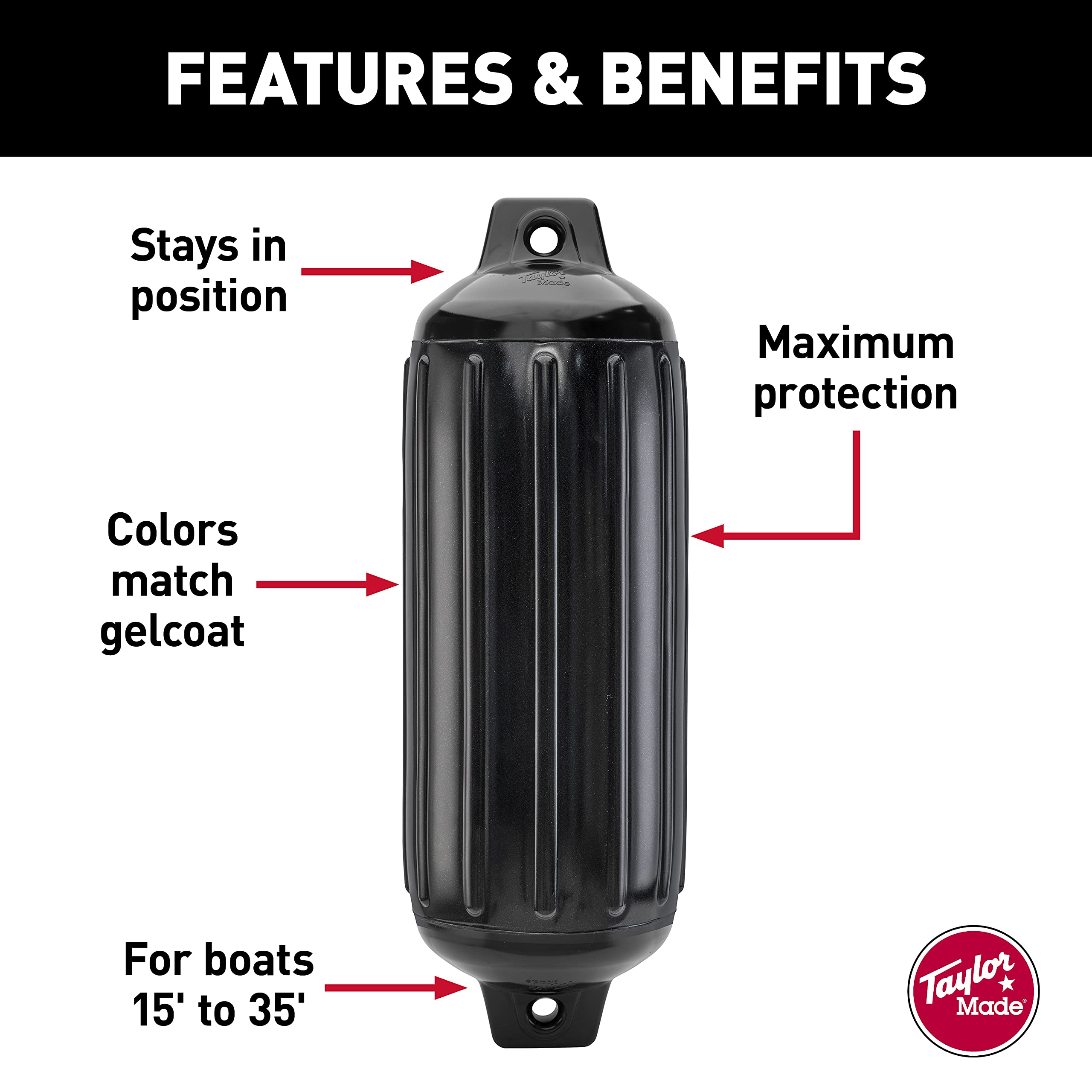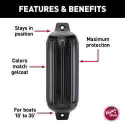 The Taylor Made 952128 Super Gard inflatable vinyl boat fender delivers premium protection for your vessel with advanced construction technology. Measuring 10-1/2" x 30", this robust black fender combines durability with sleek aesthetics to safeguard your boat from dock and hull damage.