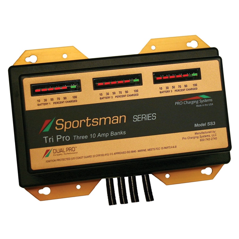 The Pro Charger SS3 Sportsman Series is a professional-grade 3-bank marine battery charger delivering 30 amps total output with three independent 10-amp banks. Manufactured by Pro Charging Systems (Dual Pro) in the USA, this waterproof charger features microprocessor-controlled PROVolt Intuitive charging technology for optimal battery performance and extended runtime.