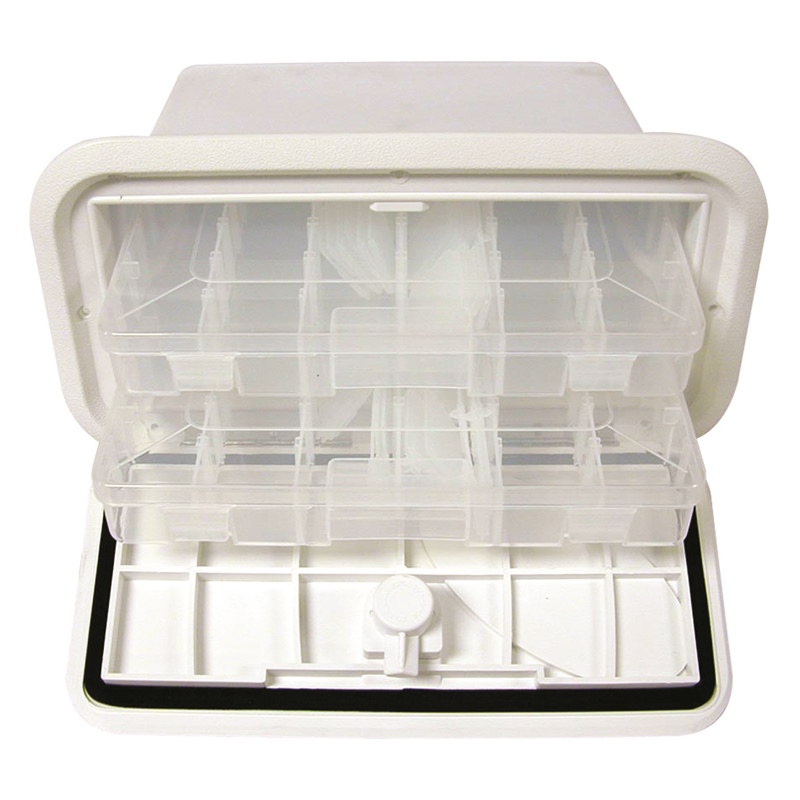 This tackle center tray is an ideal organizational solution for boaters and anglers who want to maximize their storage space while keeping gear protected and easy to access. The white finish complements most boat interiors and marine applications.