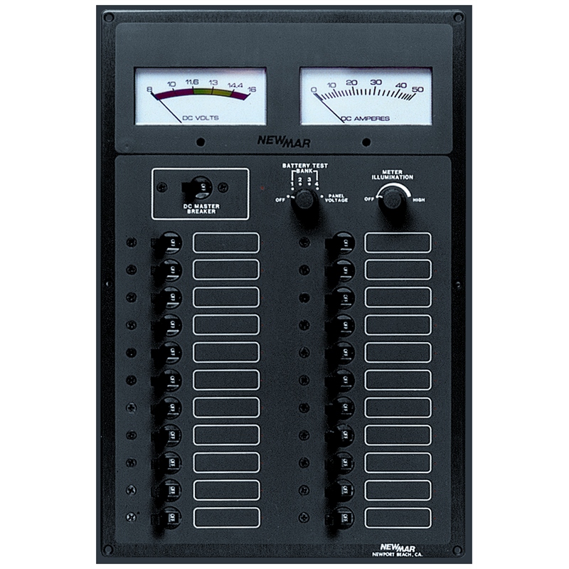 The NewMar ES-1 Elite DC Panel is a comprehensive master control panel designed for marine and RV electrical systems. This professional-grade DC distribution panel offers extensive circuit capacity and can function as a standalone unit or integrate with the ES-2 panel to create a complete AC-DC control and monitoring system.