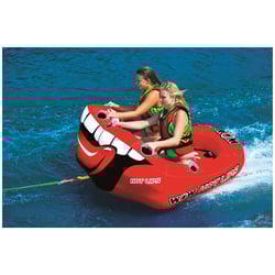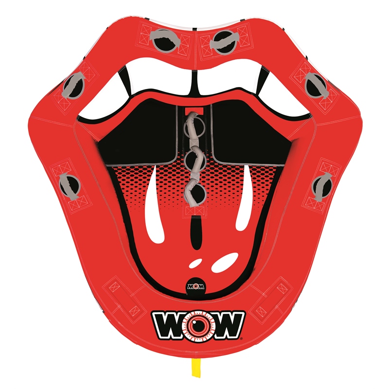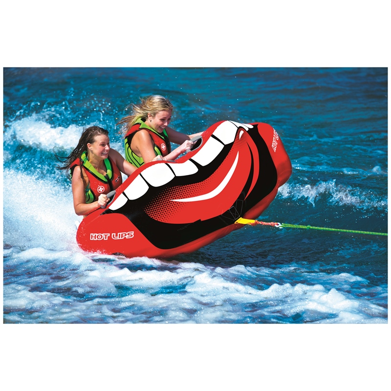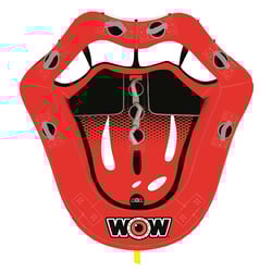 The WOW Sports Hot Lips inflatable towable tube brings playful personality and high performance to the lake. This eye-catching water tube features a unique oversized hot lips design that's guaranteed to turn heads, with custom big mouth graphics on the front cockpit and a smile tongue design on the rear.