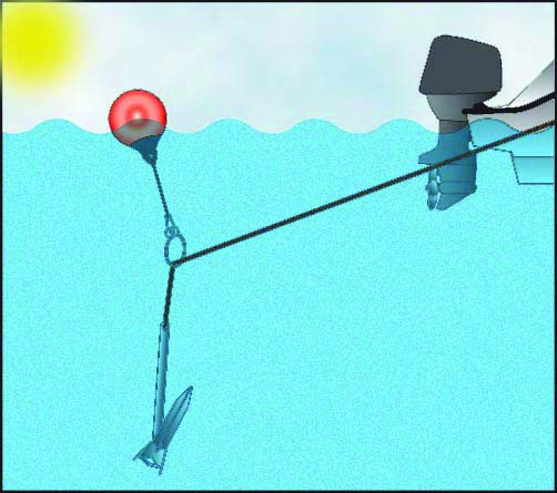 To use, attach the ring to your anchor rode, connect a buoy with a snap and line to the hoops, and deploy. The buoy's flotation helps mark the anchor's position and can assist in pulling it free. A large fender makes an excellent substitute for a dedicated buoy. Every well-equipped boat should carry this inexpensive insurance against anchor retrieval problems.
