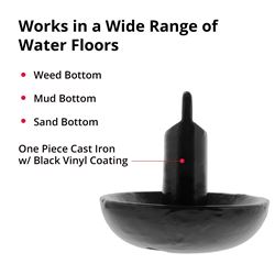 Mushroom anchors work by creating suction in soft substrates, making them particularly effective in muddy lake bottoms, river beds, and marshy areas where traditional fluke anchors may struggle. The vinyl coating not only protects your boat but also helps prevent rust and corrosion. Best suited for calm, protected waters rather than open ocean or high-current environments.