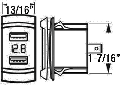 This Dual USB Rocker Switch Style Voltmeter charges two devices simultaneously while also displaying the batteries output. Fits into any 13/16” x 1-7/16” rocker switch hole. The total output 4.8A load is split 2.4A per side as needed. Enough power to