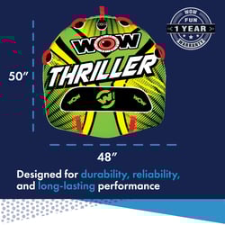 The Wow Sports Thriller is a single-rider towable tube designed for thrilling water adventures. This high-performance tube features a tapered construction that sits higher in the front than the back, preventing submarining and keeping riders on top of the water for maximum excitement.