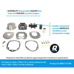 The Quicksilver 8M0113799 water pump repair kit provides everything needed for a complete water pump rebuild on Mercury 30-125HP 2-stroke and 4-stroke outboards, as well as Force 75-120HP 2-stroke outboards. This comprehensive kit ensures reliable cooling system performance and prevents overheating issues.