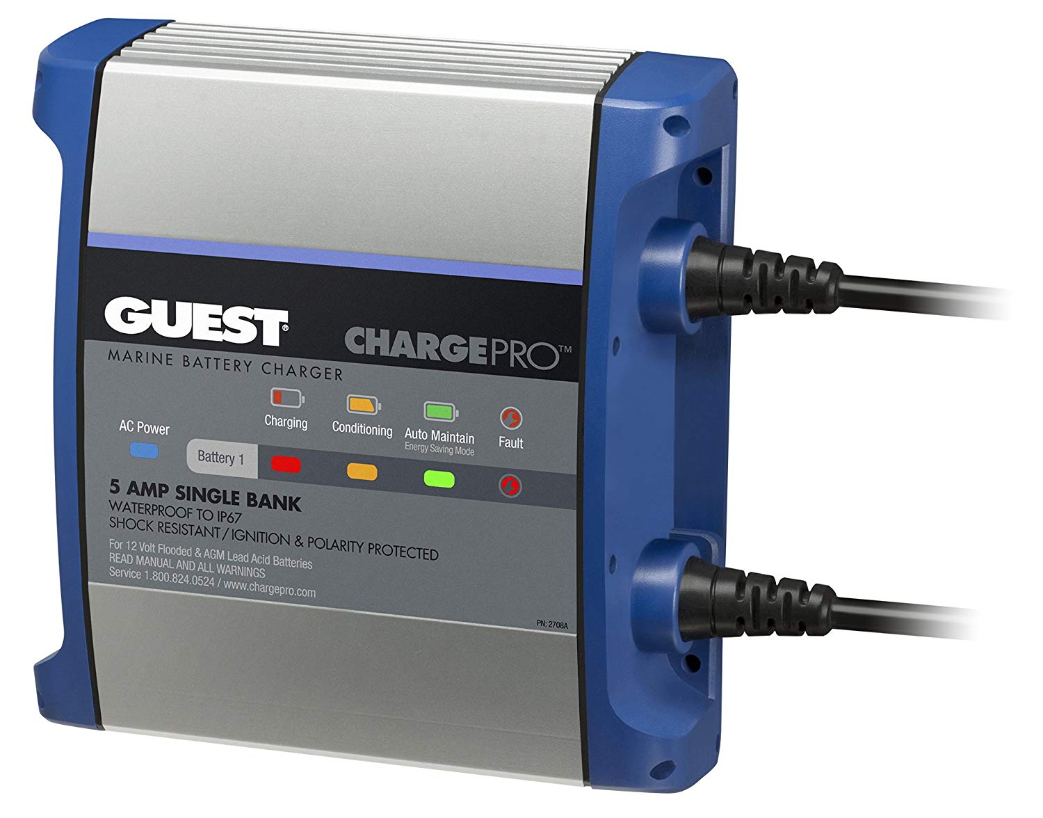The AFI 2708A Guest ChargePro is a fully automatic 5-amp on-board battery charger designed specifically for marine applications. This single-bank charger utilizes advanced high-frequency digital charging technology with a 5-stage performance charging process to safely and efficiently maintain 12-volt flooded and AGM lead acid batteries.