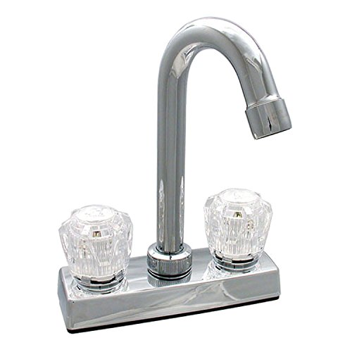This faucet combines stylish chrome-plated aesthetics with practical functionality for smaller kitchen and bar sink installations. The clear acrylic handles add a decorative touch while providing easy temperature control. The plastic compression valve system ensures reliable water flow control, and the compact footprint makes it an excellent choice for space-conscious mobile and marine applications.
