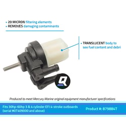 The Quicksilver 879884T is an under-cowl inline fuel filter assembly designed specifically for Mercury 30-60hp 3-cylinder and 4-cylinder EFI 4-stroke outboards with screw-on type filter bowls. This essential fuel system component protects your engine by filtering out water, moisture, and fuel contaminants before they can reach critical engine components and rob your outboard of performance.