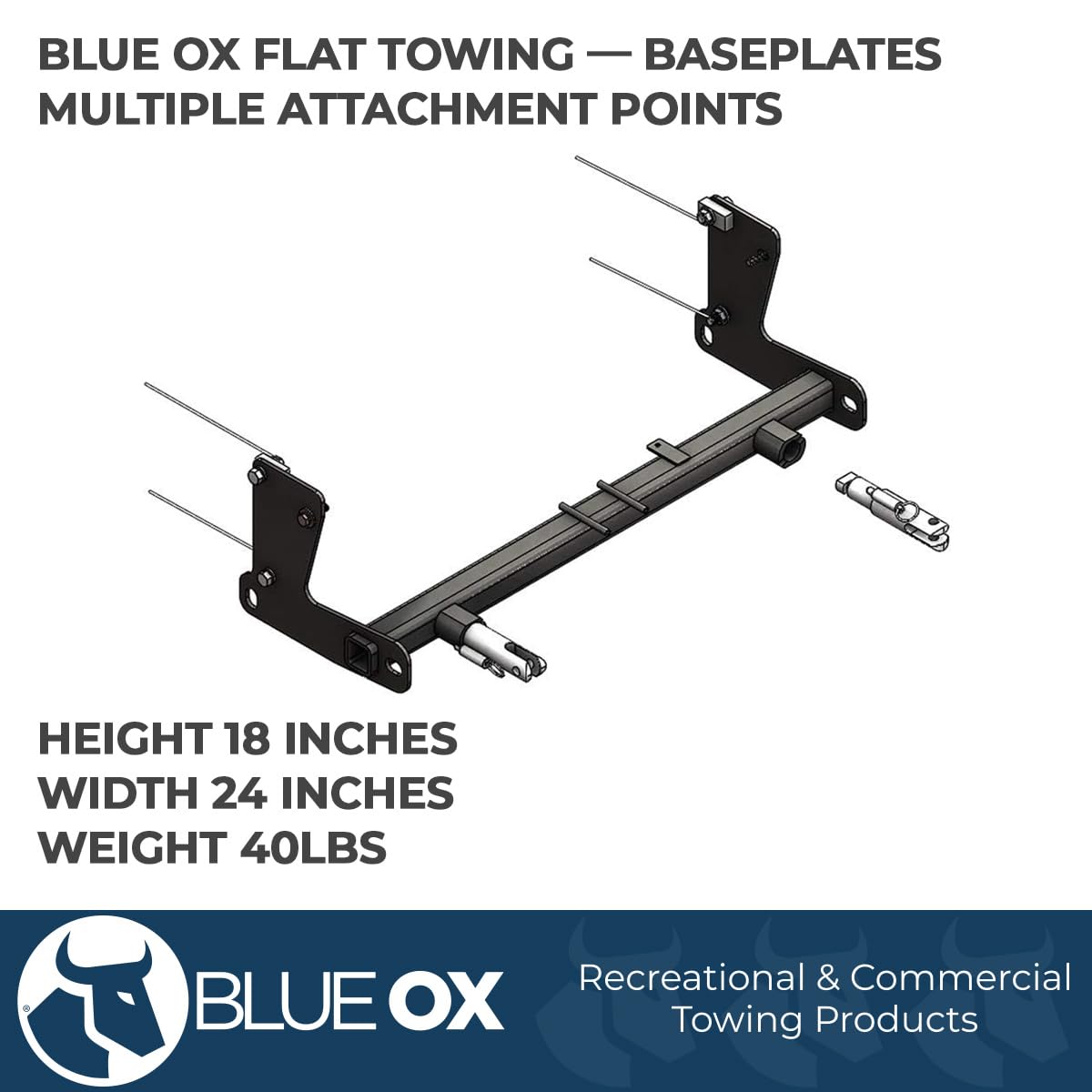 Note: Tow bar, safety cables, wiring harness, and supplemental braking system are sold separately. Professional installation recommended. Always consult your vehicle owner's manual to verify flat towing compatibility and procedures.
