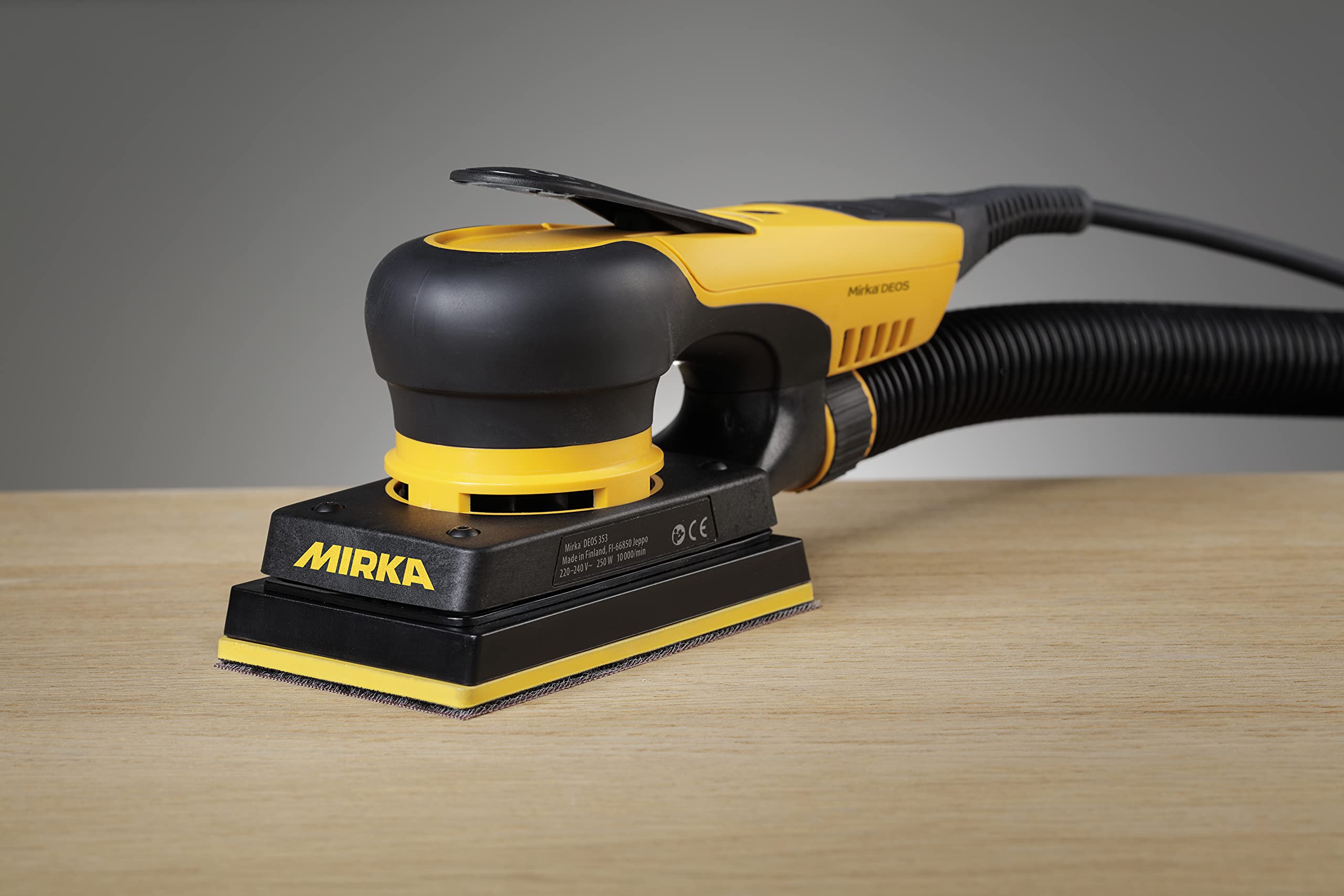 Includes backing pad 8292353011. The Mirka Deos combines compact design with professional-grade performance, making it an excellent choice for automotive refinishing, woodworking, and general finishing applications where control and precision are paramount.
