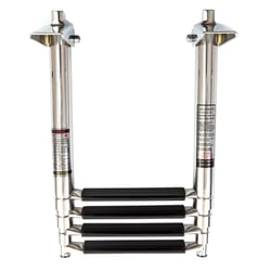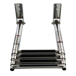 This ladder mounts directly to your boat, dock, or swim platform (platform not included). The telescoping mechanism allows the ladder to collapse flat on top of your mounting surface, keeping it out of the way during travel and reducing drag. The combination of stainless steel construction and plastic treads ensures years of reliable service in harsh marine environments.