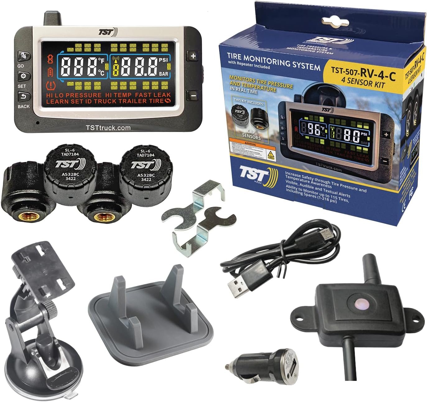 The Truck System Technologies TST507RV4 is a professional-grade tire pressure monitoring system designed specifically for RVs, travel trailers, and campers. This complete 4-sensor TPMS kit provides real-time monitoring of both tire pressure and temperature, helping prevent dangerous blowouts and improve fuel efficiency by maintaining proper tire inflation.