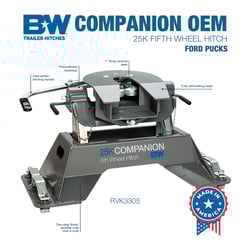The B&W RVK3305 Companion 5th Wheel Hitch Kit is designed specifically for Ford trucks equipped with the factory-installed puck system, delivering a 25,000-lb towing capacity without the need for mounting rails. This custom fifth wheel hitch provides a secure, direct connection to your truck's OEM puck system for maximum stability and convenience.