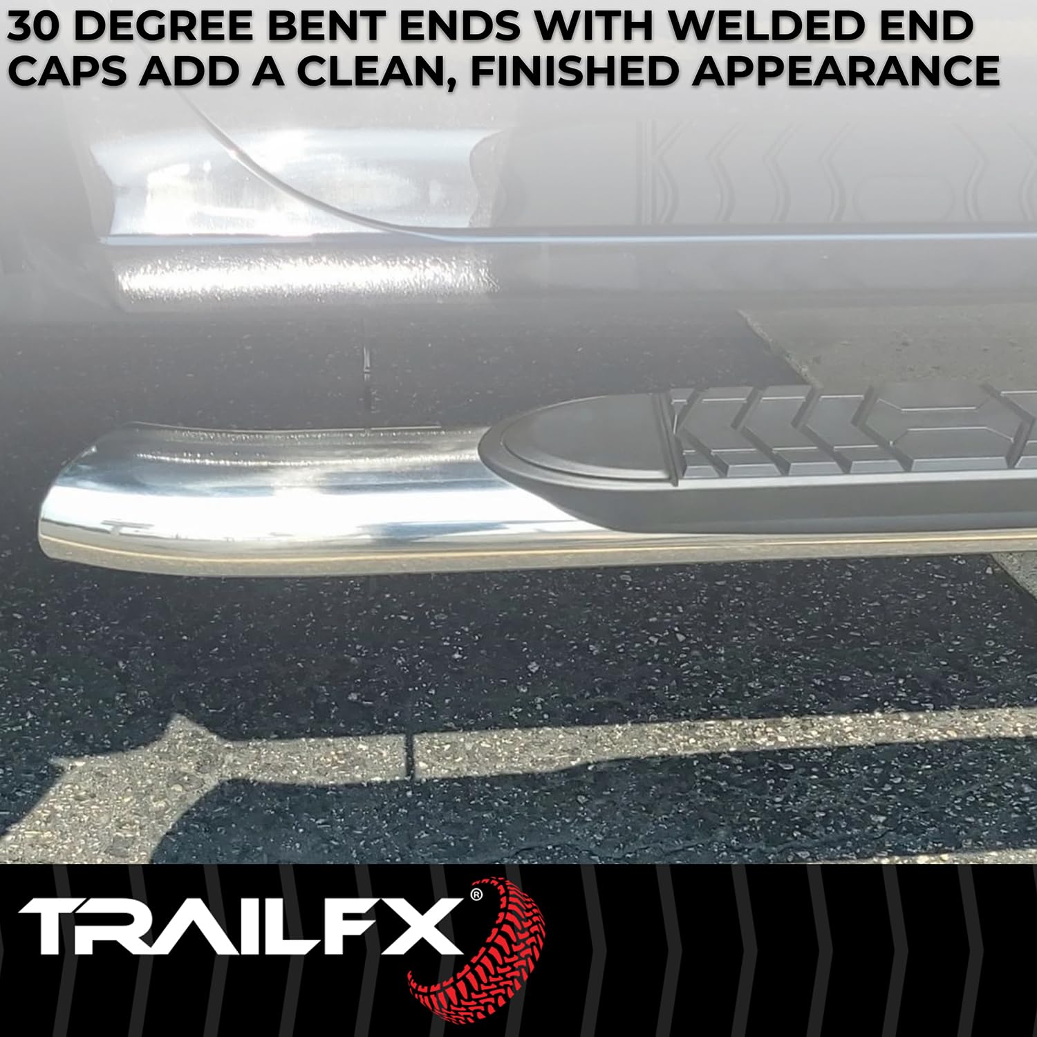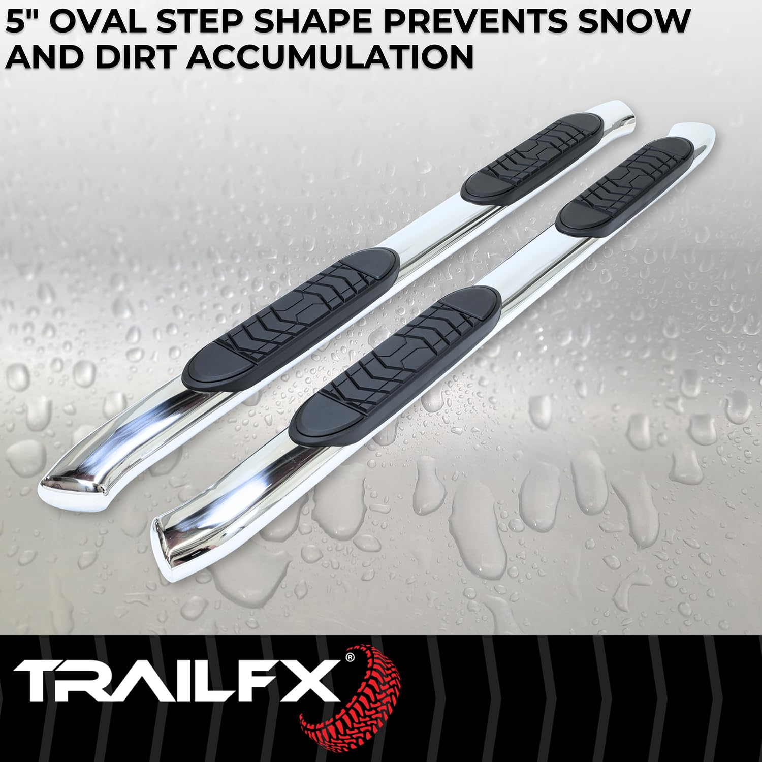 The TrailFX A7081S oval nerf bars combine rugged functionality with sleek styling for your truck or SUV. Constructed from polished stainless steel, these rocker panel guards feature a 5-inch oval tube design that provides an extra-wide stepping surface for easier entry and exit from your vehicle.