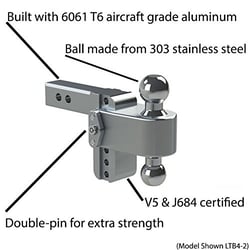 The Weigh Safe LTB8-2-KA is a heavy-duty adjustable ball mount designed for 2" trailer hitch receivers, offering exceptional versatility and security for towing applications up to 12,500 lbs gross trailer weight. This premium aluminum drop hitch features an 8" adjustable drop range, allowing you to achieve the perfect trailer height alignment for safe, level towing.
