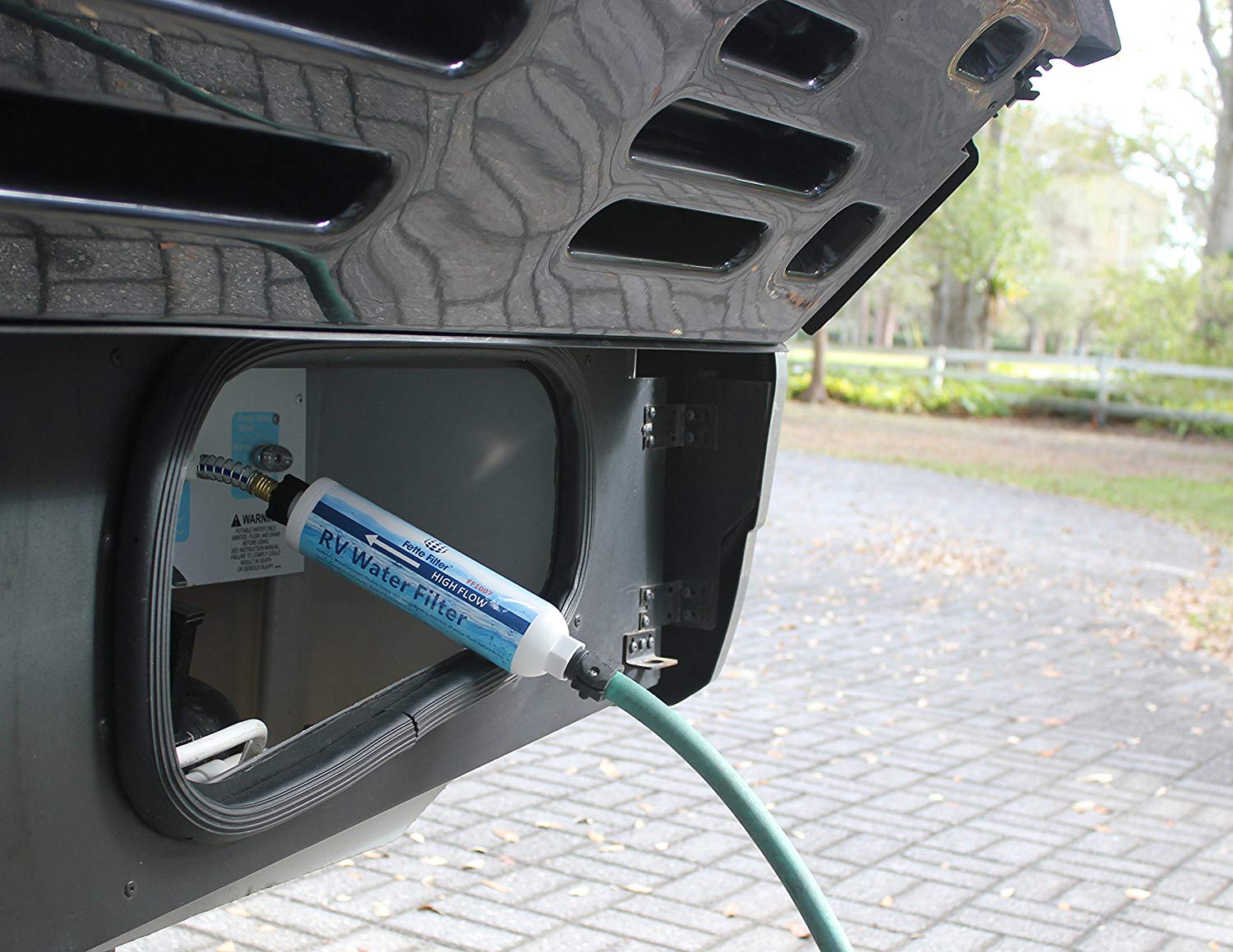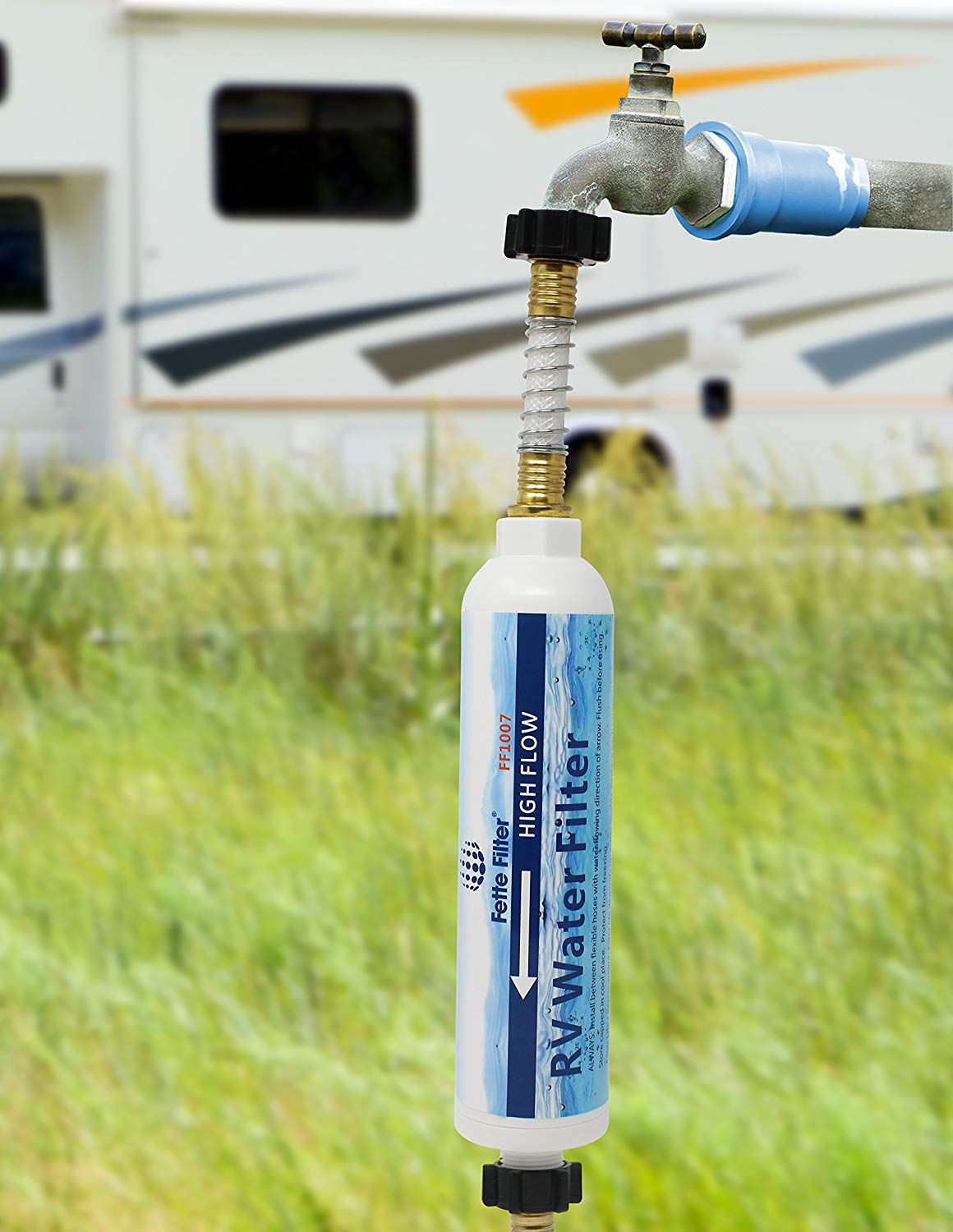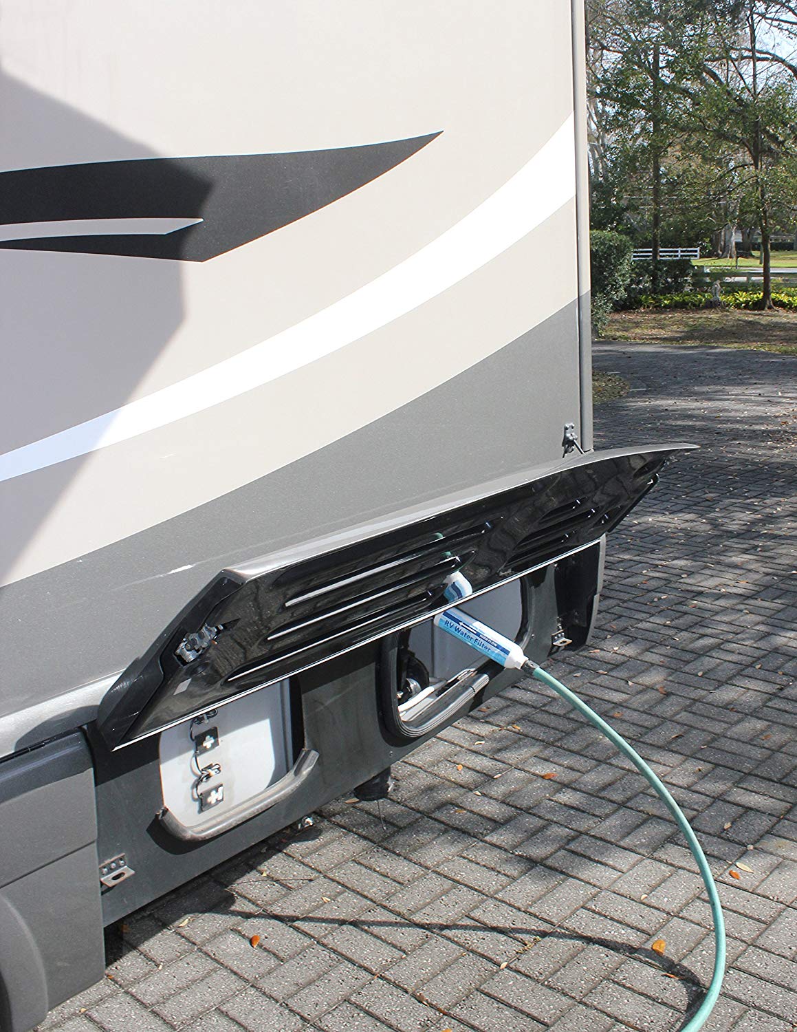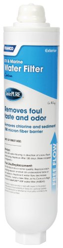 The Camco 40645 TastePURE Water Filter is designed to provide clean, fresh-tasting water for your RV or marine vessel. This inline canister-style filter connects directly to your standard garden hose with female coupling, filtering water before it enters your holding tank for improved water quality throughout your system.