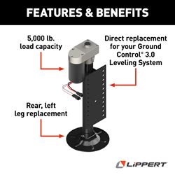 The Lippert Components 305339 is a replacement hall effect jack assembly designed specifically for the Ground Control 3.0 automatic 5th wheel leveling system. This complete jack assembly is engineered for the left rear (follow leg) position and features advanced hall effect sensor technology for precise position monitoring and control.