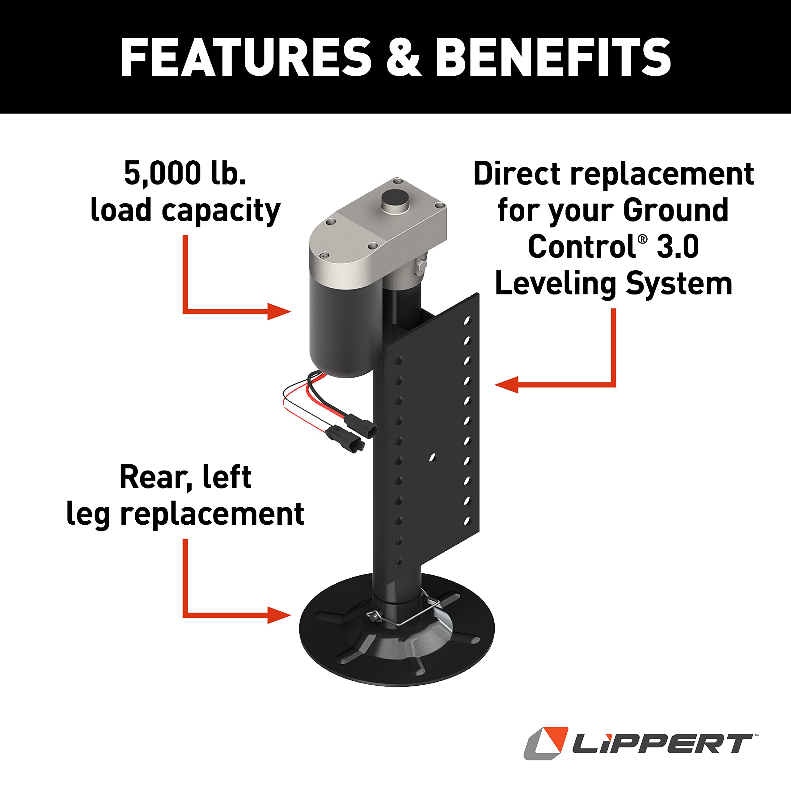 This replacement jack is a genuine Lippert Components part that ensures compatibility and performance with your existing Ground Control 3.0 system. The hall effect sensor provides the system controller with real-time position data, enabling automatic leveling without user intervention. The included mounting plate simplifies installation when replacing a worn or damaged jack assembly.