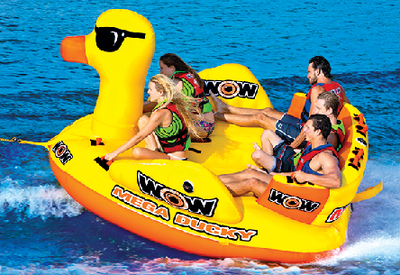 "Taking the WOW Ducky to the next level! This massive MEGA DUCKY is ready to take the whole gang for a ride. The MEGA DUCKY makes the ultimate statement on the water and features front and back tow points so riders get 2 ride options in 1 tube. This giant lake cruiser is a classic couch style towable with a HUGE deck area that will hold up to 5 PEOPLE. The side wings are designed to help contain the riders on the deck. Each seat is equipped with foam pads and handles for a SECURE ride. And after your ride is over the Mega Ducky makes a perfect floating island on the water. Anchor it down or tie it to the dock for a fun floating playground or comfy relaxation spot on the water. 1 year warranty.