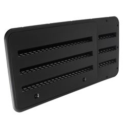 This assembly replaces worn or damaged vent doors to restore proper airflow and maintain optimal refrigerator efficiency. The black finish matches standard RV exterior panels for a seamless installation.