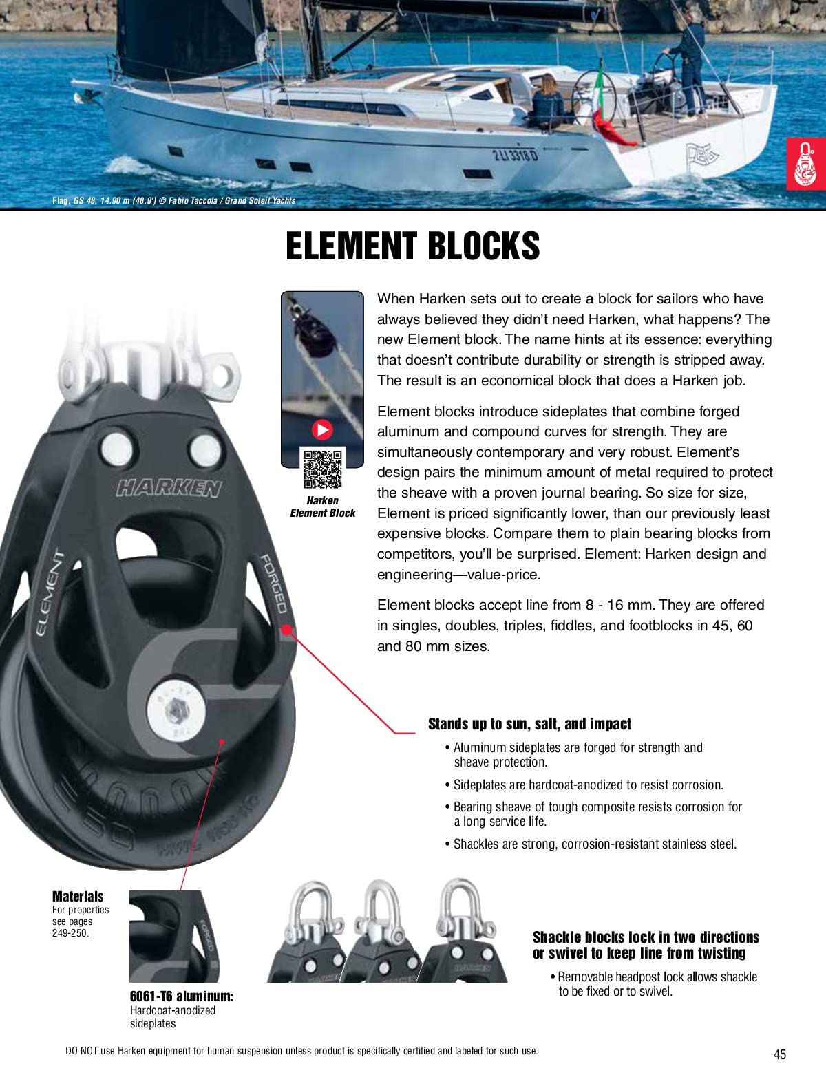 The Harken 6231 Element block features innovative sideplates that combine forged aluminum with compound curves for exceptional strength and durability. This 45mm single block with becket and swivel/locking shackle pairs minimal metal protection with a proven journal bearing system for reliable performance in demanding marine conditions.