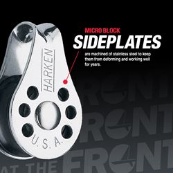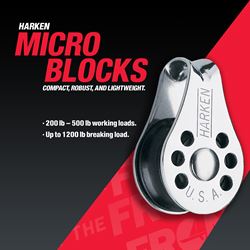 Low-friction Micro Blocks are extremely lightweight, free-running blocks. Designed for any number of uses on dinghies and for lightly loaded control lines on boats of all sizes. Derlin ball bearings are UV stablized with carbon black for maximum protection and stainless steel sideplates add strength. Use inside masts, booms, lead car returns and tackle.